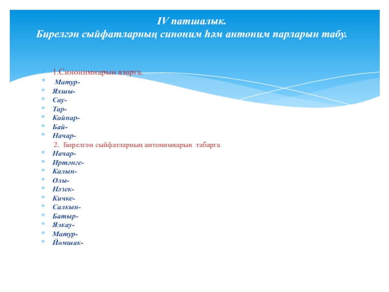 Бирелгән сыйфатларның синоним һәм антоним парларын табу.