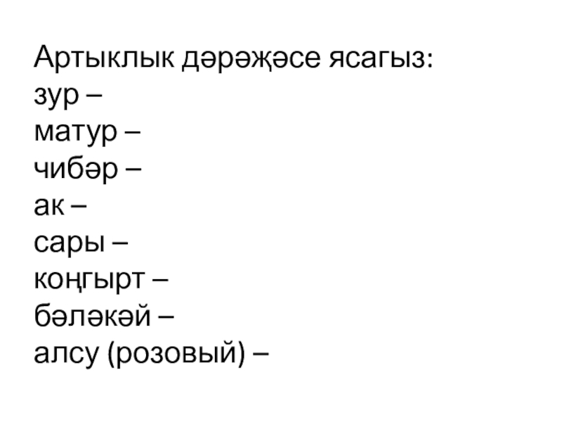 Слайд 20Артыклык дәрәҗәсе ясагыз: зур – матур – чибәр – ак – сары –