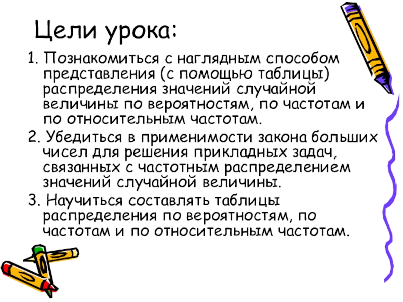 Цели урока:1. Познакомиться с наглядным способом представления (с помощью таблицы) распределения значений случайной величины по вероятностям, по частотам и по относительным частотам.2. Убедиться в применимости закона больших чисел для решения прикладных задач, связанных с частотным распределением