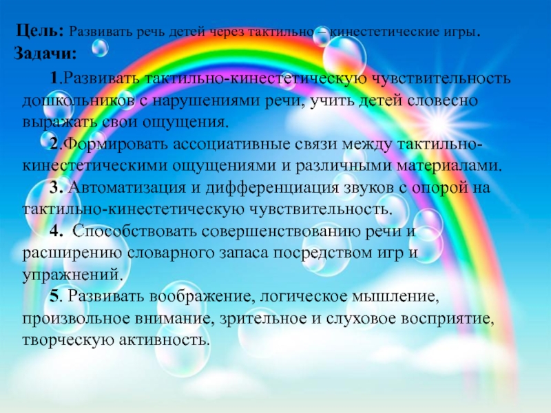 1.Развивать тактильно-кинестетическую чувствительность дошкольников с нарушениями речи, учить детей словесно выражать свои ощущения.