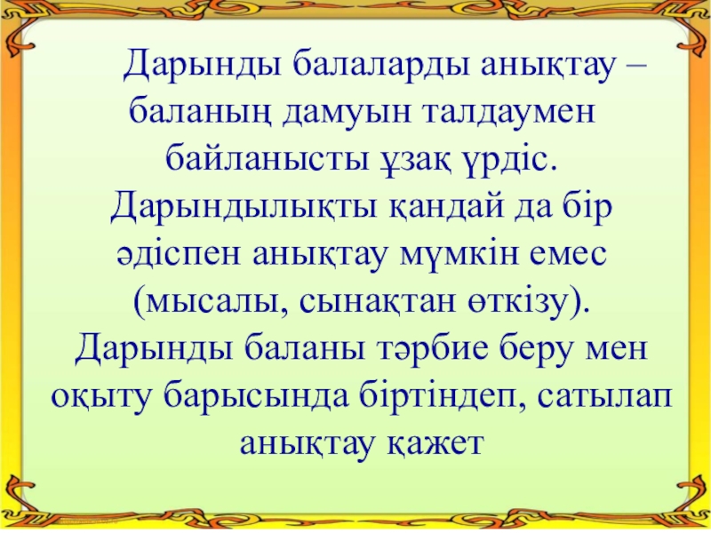 үрдіс. Дарындылықты қандай да бір әдіспен анықтау мүмкін емес (мысалы, сынақтан өткізу). Дарынды баланы тәрбие беру мен оқыту барысында біртіндеп, сатылап анықтау қажет
