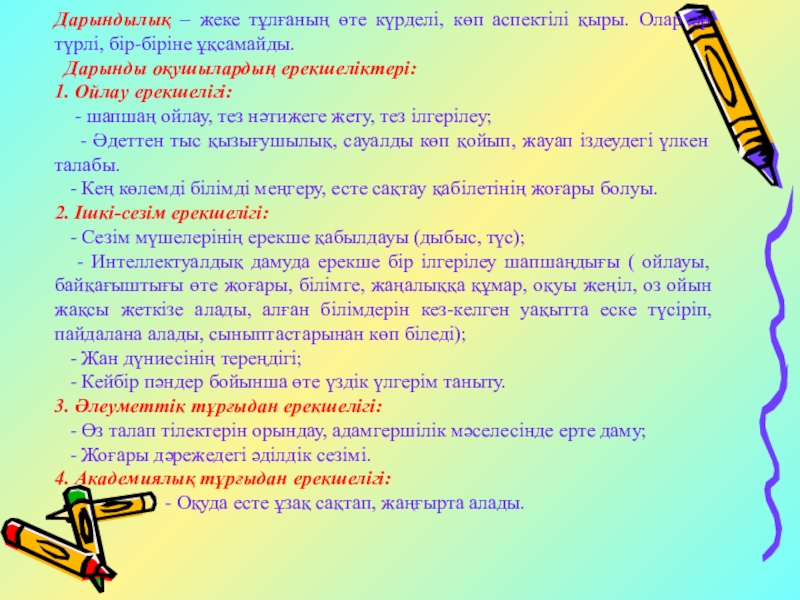 Дарынды оқушылардың ерекшеліктері: