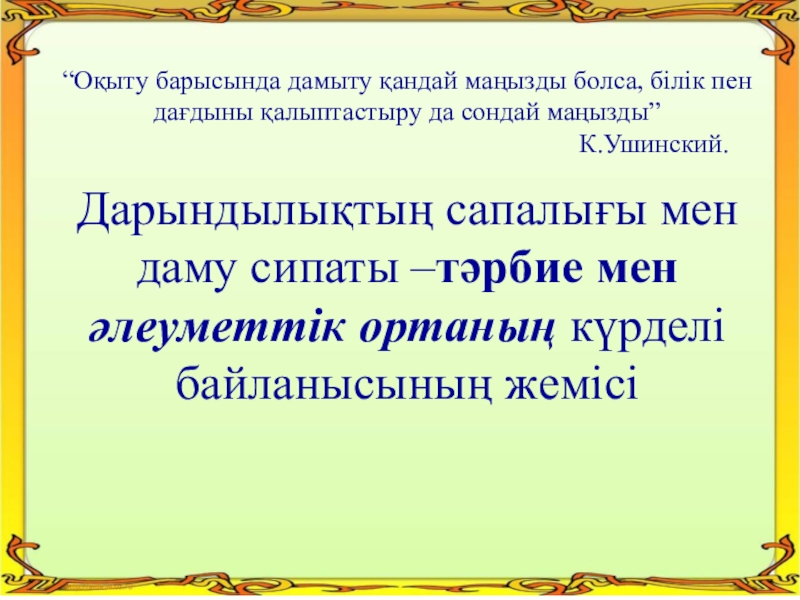 Дарындылықтың сапалығы мен даму сипаты –тәрбие мен әлеуметтік ортаның күрделі байланысының жемісі
