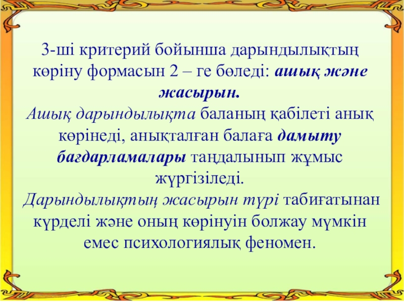 3-ші критерий бойынша дарындылықтың көріну формасын 2 – ге бөледі: ашық