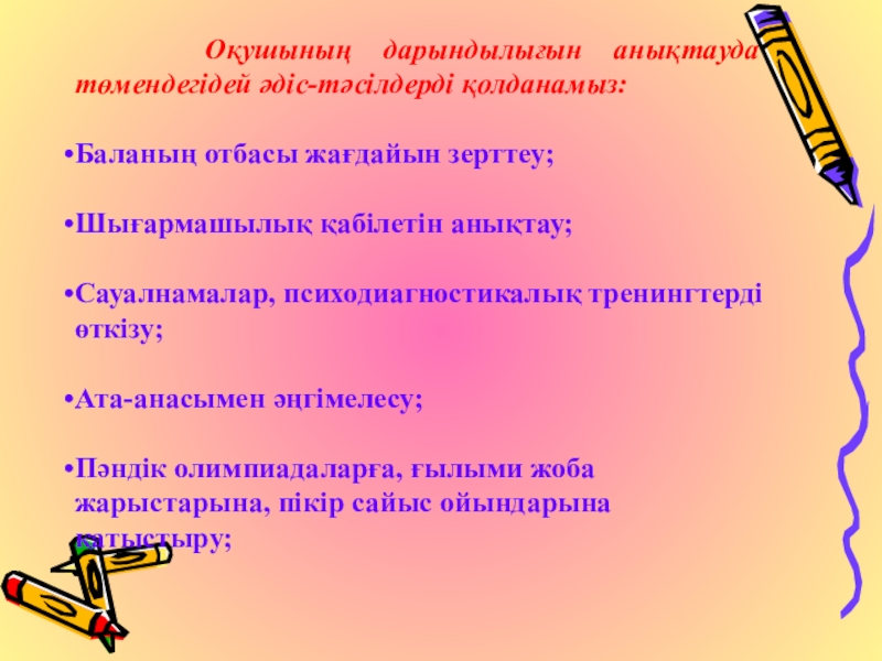 Слайд 10 Оқушының дарындылығын анықтауда төмендегідей әдіс-тәсілдерді қолданамыз: