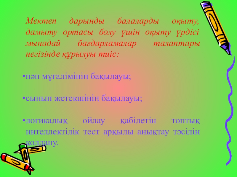 Слайд 12Мектеп дарынды балаларды оқыту, дамыту ортасы болу үшін оқыту үрдісі мынадай