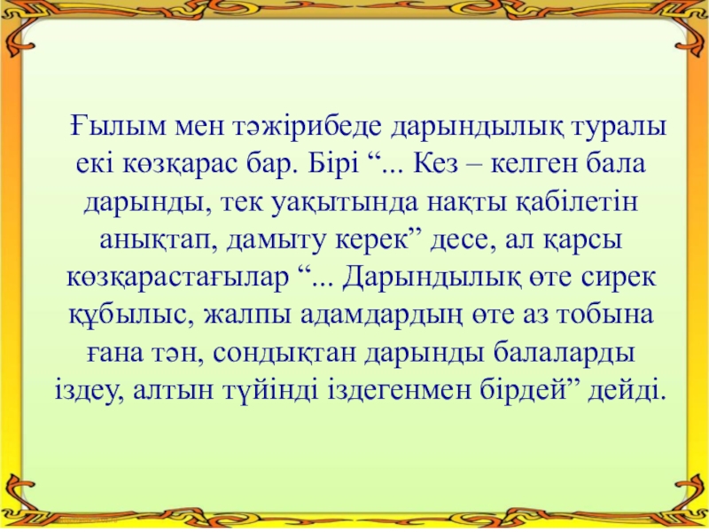 Кез – келген бала дарынды, тек уақытында нақты қабілетін анықтап, дамыту керек” десе, ал қарсы көзқарастағылар “... Дарындылық өте сирек құбылыс, жалпы адамдардың өте аз тобына ғана тән, сондықтан дарынды балаларды іздеу, алтын түйінді іздегенмен бірдей” дейді.