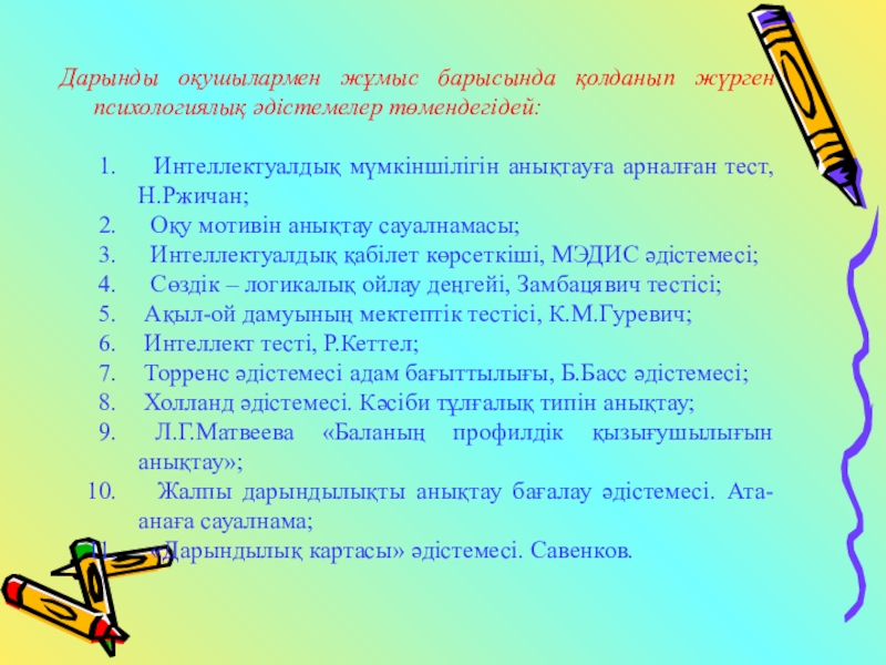 Слайд 11Дарынды оқушылармен жұмыс барысында қолданып жүрген психологиялық әдістемелер төмендегідей: