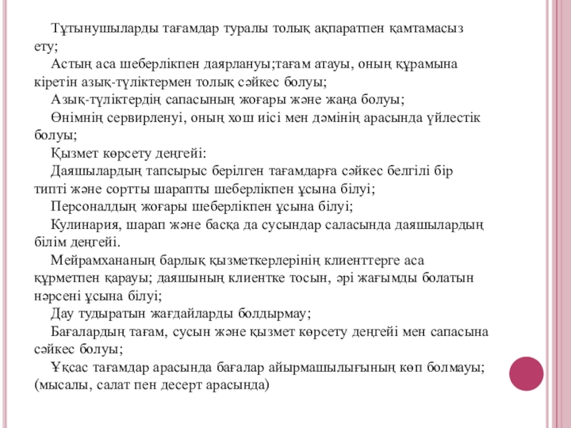 Тұтынушыларды тағамдар туралы толық ақпаратпен қамтамасыз ету;Астың аса шеберлікпен даярлануы;тағам атауы, оның құрамына кіретін азық-түліктермен толық сәйкес