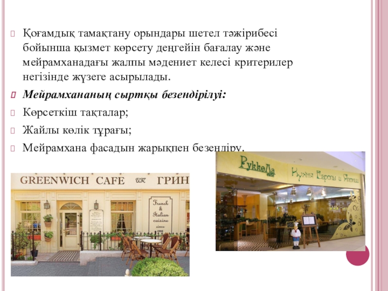Қоғамдық тамақтану орындары шетел тәжірибесі бойынша қызмет көрсету деңгейін бағалау және мейрамханадағы жалпы мәдениет келесі критерилер негізінде жүзеге асырылады.Мейрамхананың сыртқы безендірілуі:Көрсеткіш тақталар;Жайлы көлік тұрағы;Мейрамхана фасадын жарықпен безендіру.