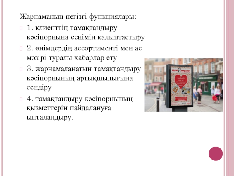 Жарнаманың негізгі функциялары:1. клиенттің тамақтандыру кәсіпорнына сенімін қалыптастыру2. өнімдердің ассортименті мен ас мәзірі туралы хабарлар ету3. жарнамаланатын