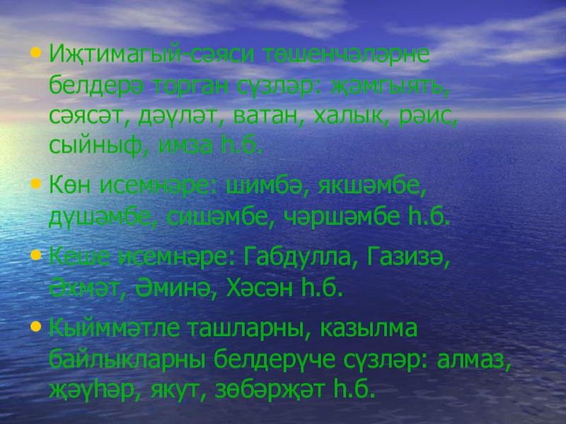 Слайд 8Иҗтимагый-сәяси төшенчәләрне белдерә торган сүзләр: җәмгыять, сәясәт, дәүләт, ватан, халык, рәис,