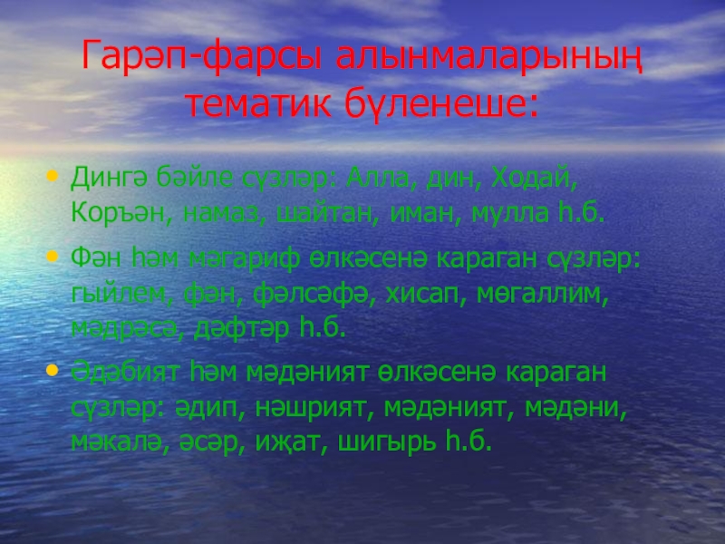Слайд 7Гарәп-фарсы алынмаларының тематик бүленеше: