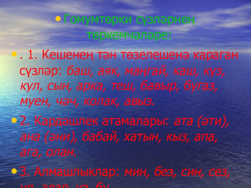 3. Алмашлыклар: мин, без, син, сез, ул, алар, үз, бу.