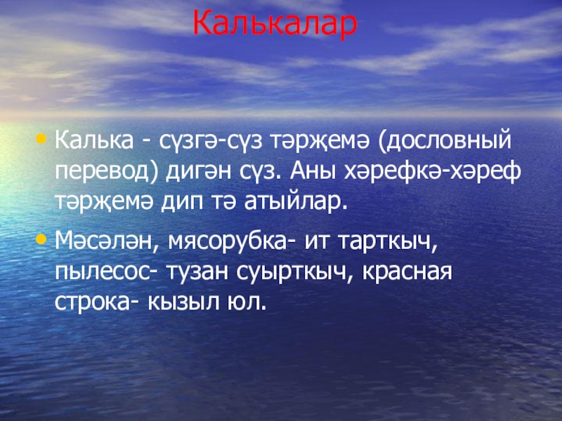 Калька - сүзгә-сүз тәрҗемә (дословный перевод) дигән сүз. Аны хәрефкә-хәреф тәрҗемә