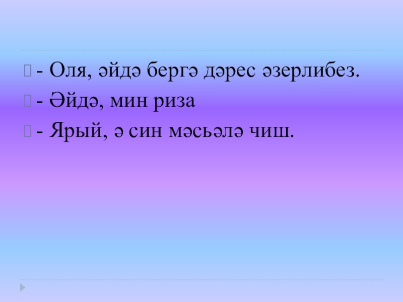 - Оля, әйдә бергә дәрес әзерлибез.- Әйдә, мин риза- Ярый, ә син мәсьәлә чиш.