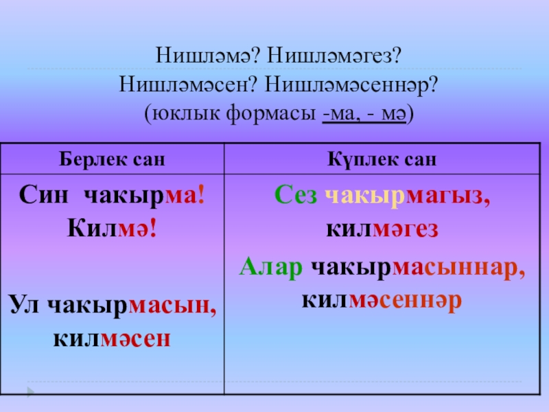 Нишләмә? Нишләмәгез? Нишләмәсен? Нишләмәсеннәр? (юклык формасы -ма, - мә)
