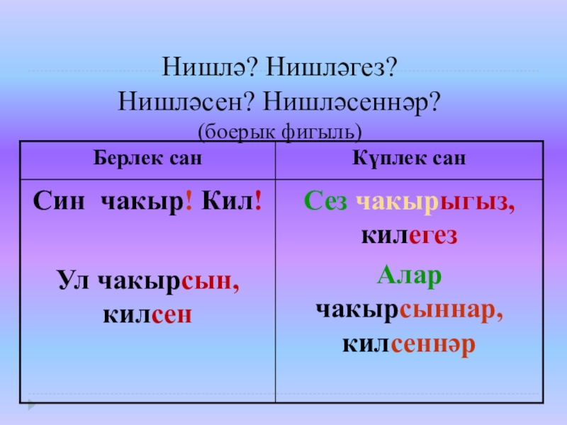 Слайд 6Нишлә? Нишләгез? Нишләсен? Нишләсеннәр? (боерык фигыль)