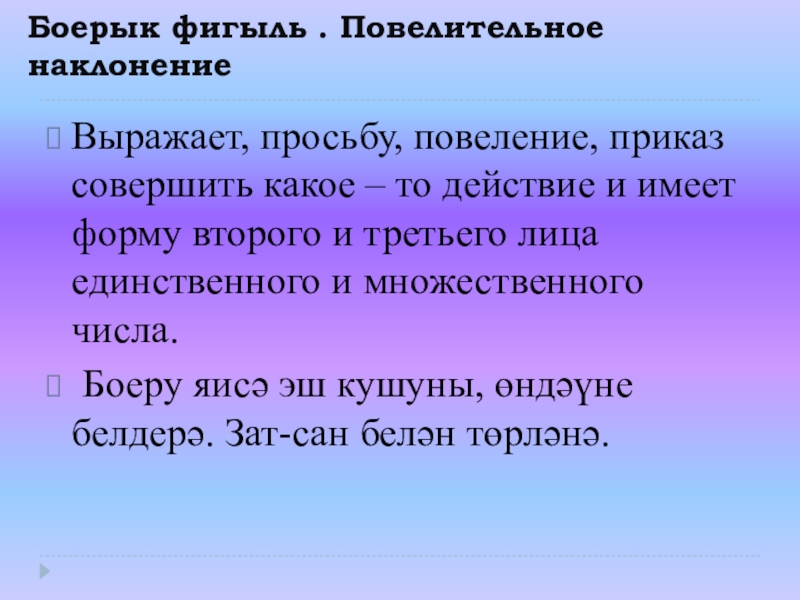 Боерык фигыль . Повелительное наклонениеВыражает, просьбу, повеление, приказ совершить какое – то действие и имеет форму второго