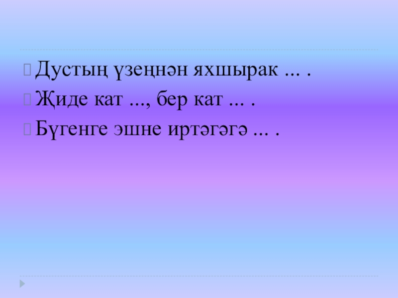 Дустың үзеңнән яхшырак ... .Җиде кат ..., бер кат ... .Бүгенге эшне иртәгәгә ... .