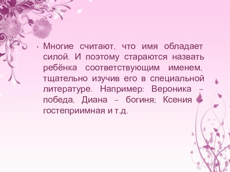 соответствующим именем, тщательно изучив его в специальной литературе. Например: Вероника – победа, Диана – богиня; Ксения – гостеприимная и т.д.