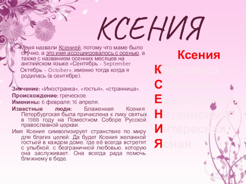Имя Ксения символизирует странствие по миру для благих целей. Да будет Ксения желанной гостьей в каждом доме, где её всегда встретят с улыбкой, с безграничной любовью, которую она заслуживает. Она всегда рада помочь ближнему в беде.