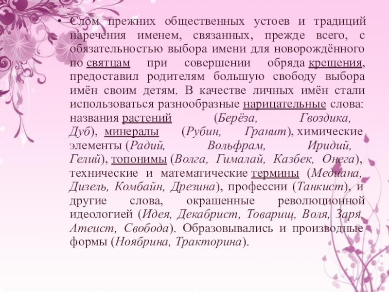 с обязательностью выбора имени для новорождённого по святцам при совершении обряда крещения, предоставил родителям большую свободу выбора имён своим детям. В качестве личных имён стали использоваться разнообразные нарицательные слова: названия растений (Берёза, Гвоздика, Дуб), минералы (Рубин, Гранит), химические элементы (Радий, Вольфрам, Иридий, Гелий), топонимы (Волга, Гималай, Казбек, Онега), технические и математические термины (Медиана, Дизель, Комбайн, Дрезина), профессии (Танкист), и другие слова, окрашенные революционной идеологией (Идея, Декабрист, Товарищ, Воля, Заря, Атеист, Свобода). Образовывались и производные формы (Ноябрина, Тракторина).