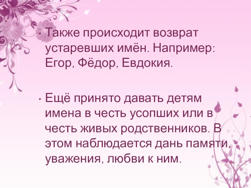 Слайд 16Также происходит возврат устаревших имён. Например: Егор, Фёдор, Евдокия.
