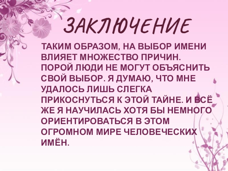 ЛЮДИ НЕ МОГУТ ОБЪЯСНИТЬ СВОЙ ВЫБОР. Я ДУМАЮ, ЧТО МНЕ УДАЛОСЬ ЛИШЬ СЛЕГКА ПРИКОСНУТЬСЯ К ЭТОЙ ТАЙНЕ. И ВСЁ ЖЕ Я НАУЧИЛАСЬ ХОТЯ БЫ НЕМНОГО ОРИЕНТИРОВАТЬСЯ В ЭТОМ ОГРОМНОМ МИРЕ ЧЕЛОВЕЧЕСКИХ ИМЁН.