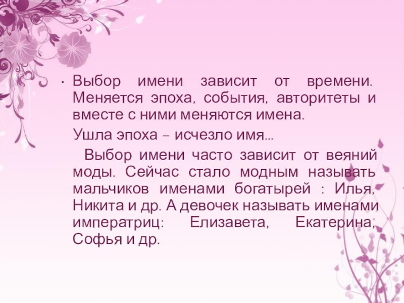 Выбор имени часто зависит от веяний моды. Сейчас стало модным называть мальчиков именами богатырей : Илья, Никита и др. А девочек называть именами императриц: Елизавета, Екатерина, Софья и др.