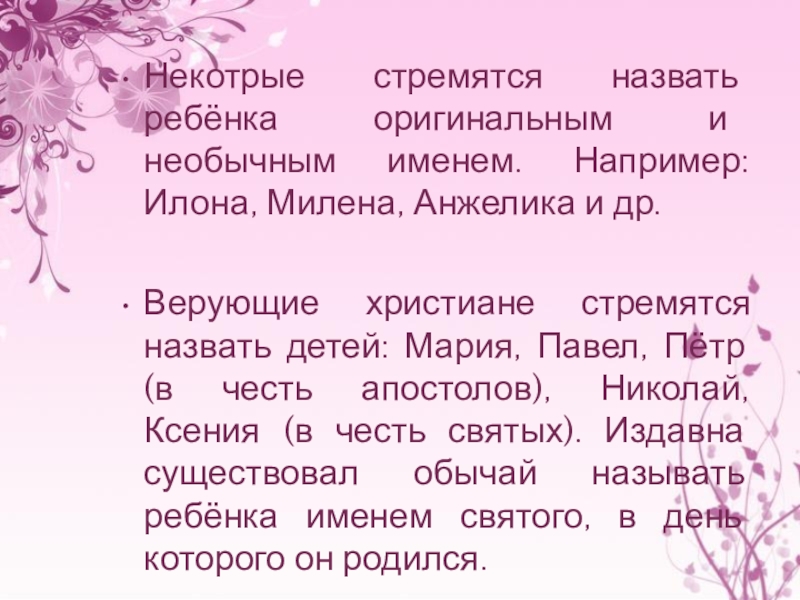 Слайд 15Некотрые стремятся назвать ребёнка оригинальным и необычным именем. Например: Илона, Милена,