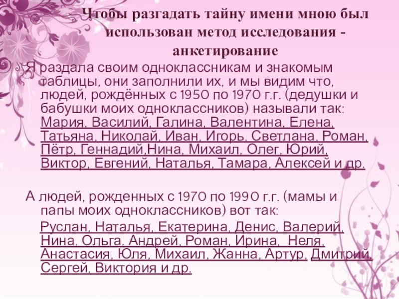 Слайд 9Чтобы разгадать тайну имени мною был использован метод исследования - анкетирование