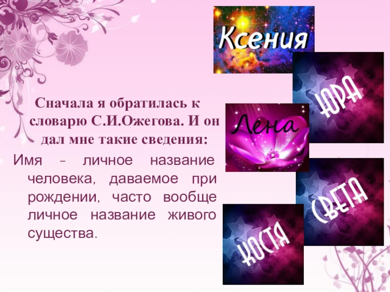 Имя - личное название человека, даваемое при рождении, часто вообще личное название живого существа.