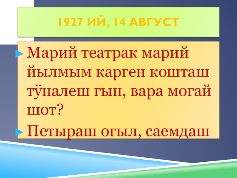 1927 ий, 14 августМарий театрак марий йылмым карген кошташ тÿналеш гын, вара могай шот?Петыраш огыл, саемдаш