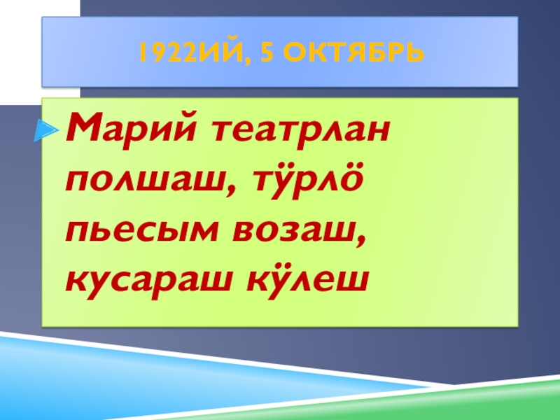 1922ий, 5 октябрьМарий театрлан полшаш, тÿрлö пьесым возаш,кусараш кÿлеш