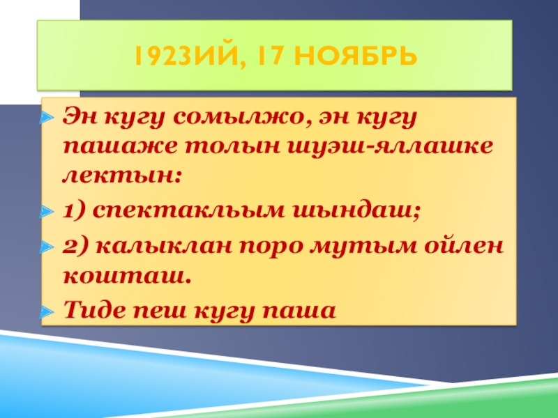 1923ий, 17 ноябрьЭн кугу сомылжо, эн кугу пашаже толын шуэш-яллашке лектын:1) спектакльым шындаш;2) калыклан поро мутым ойлен
