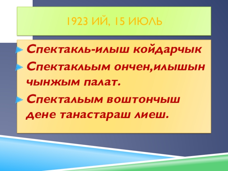 1923 ий, 15 июльСпектакль-илыш койдарчыкСпектакльым ончен,илышын чынжым палат.Спектальым воштончыш дене танастараш лиеш.