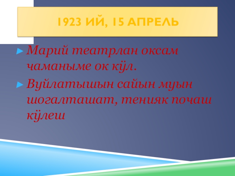 1923 ий, 15 апрельМарий театрлан оксам чаманыме ок кÿл.Вуйлатышын сайын муын шогалташат, тенияк почаш кÿлеш