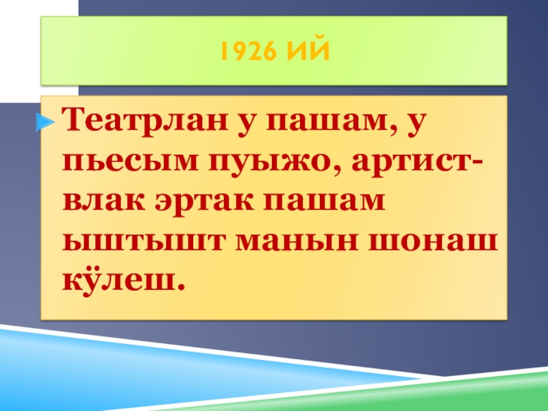 1926 ийТеатрлан у пашам, у пьесым пуыжо, артист-влак эртак пашам ыштышт манын шонаш кÿлеш.