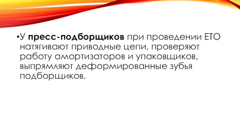 Слайд 8У пресс-подборщиков при проведении ЕТО натягивают приводные цепи, проверяют работу амортизаторов