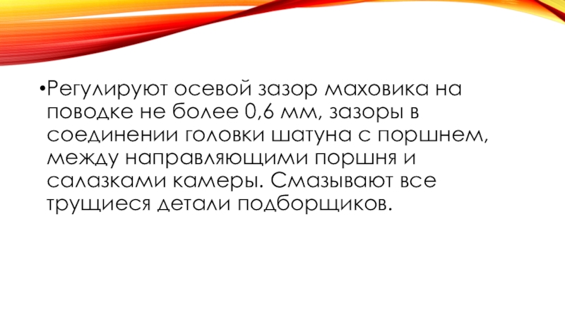 Слайд 10Регулируют осевой зазор маховика на поводке не более 0,6 мм, зазоры