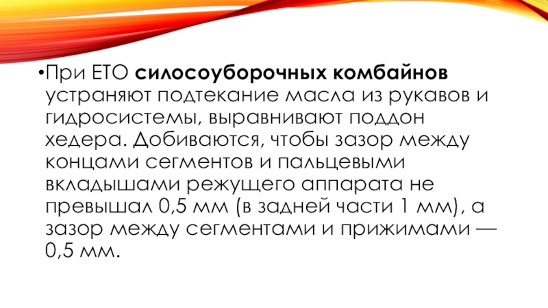 Слайд 11При ЕТО силосоуборочных комбайнов устраняют подтекание масла из рукавов и гидросистемы,
