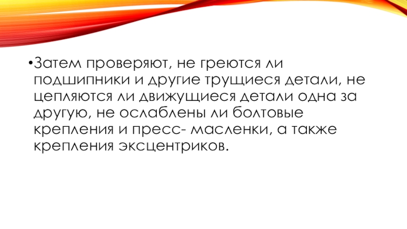 Слайд 6Затем проверяют, не греются ли подшипники и другие трущиеся детали, не