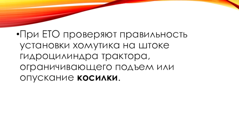 Слайд 2При ЕТО проверяют правильность установки хомутика на штоке гидроцилиндра трактора, ограничивающего