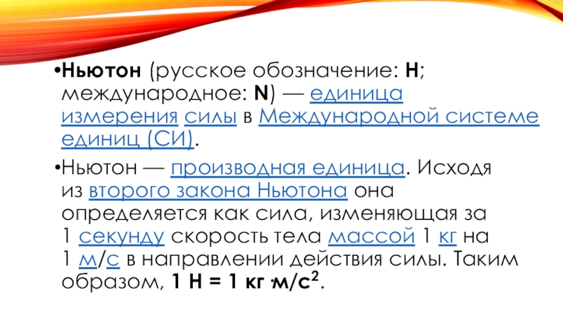 Слайд 16Ньютон (русское обозначение: Н; международное: N) — единица измерения силы в Международной системе единиц (СИ).