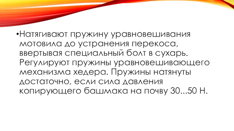 Слайд 15Натягивают пружину уравновешивания мотовила до устранения перекоса, ввертывая специальный болт в