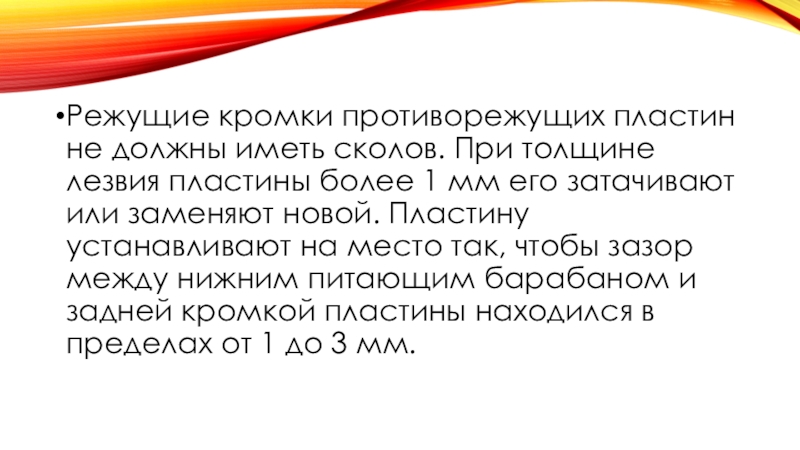 пластины более 1 мм его затачивают или заменяют новой. Пластину устанавливают на место так, чтобы зазор между нижним питающим барабаном и задней кромкой пластины находился в пределах от 1 до 3 мм.