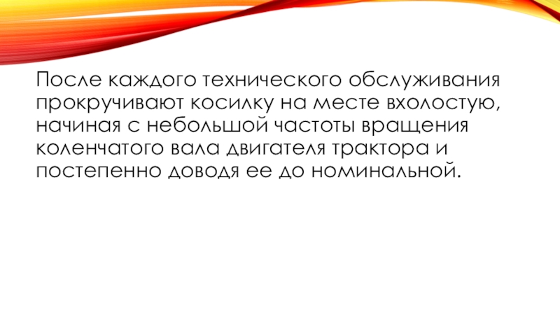 Слайд 5После каждого технического обслуживания прокручивают косилку на месте вхолостую, начиная с
