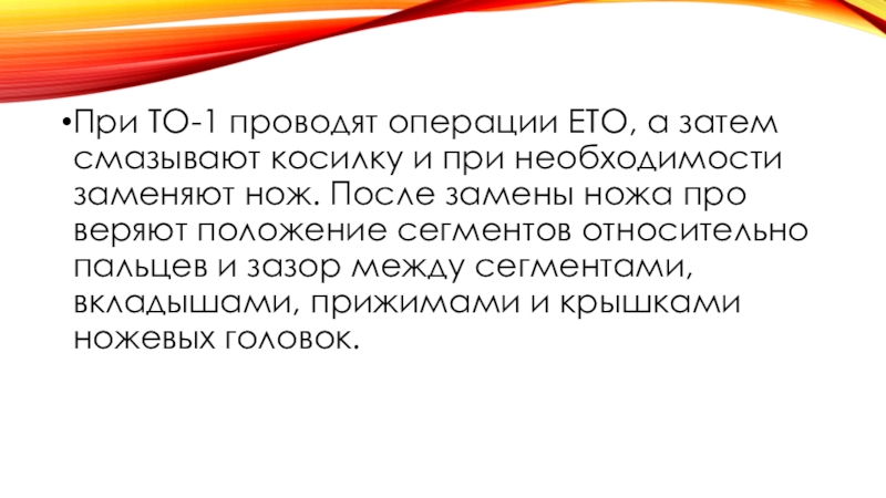 Слайд 4При ТО-1 проводят операции ЕТО, а затем смазывают косилку и при