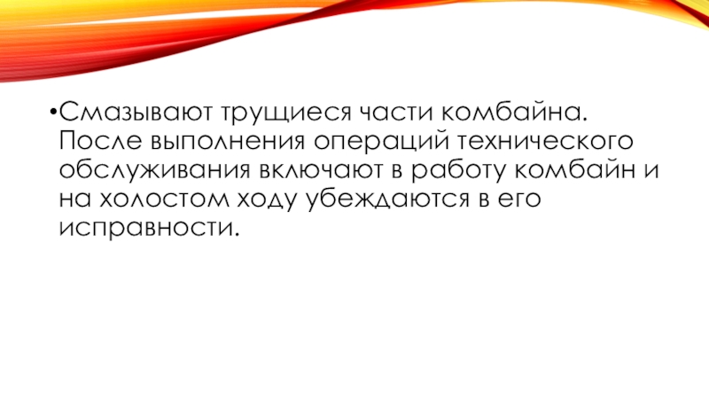 Слайд 17Смазывают трущиеся части комбайна. После выполнения операций технического обслуживания включают в